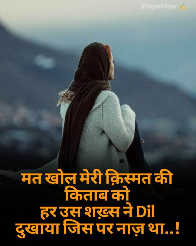 दोस्तों हमने यहां पर बेहतरीन Sad Shayari साझा कि है सैड शायरी हिंदी में अगर आप भी Sad Shayari In Hindi पढ़ना पसंद करते हैं तो यह पोस्ट जरूर पढें। दोस्तों हमारे जीवन में सुख और दुःख आते जाते रहते हैं, सुख में हम मस्ती में रहते हैं जबकि दुःख हमें परेशान कर जाता है जब इंसान दुःखी होता है तो उस पर क्या बीतती हैं वो वही जानता है। दुःखी इंसान के दो कारण होते हैं एक तो किस्मत साथ ना देने से दूसरा प्यार मोहब्बत में धोखा मिलने से। अगर आप भी किसी वजह से दुःखी है अगर आप भी अपनी लाइफ में सैड सा फील कर रहे है तो आपकी उदासी और बेचैनी को दूर करने के लिए हमने यहां पर Sad Shayari 😭Life In Hindi साझा की है। यह सैड शायरी 2 लाइन हमने सैड लड़के और लड़कियों के लिए तैयार की है। जो आजकल उदास रहते हैं और अपनी लाइफ में सैड सा फील करते हैं। खास तौर पर यह Sad Shayari In Hindi उन लोगों को ज्यादा पसंद आती है जो जिंदगी के सताए हुए होते हैं, जो अपनी किस्मत से और अपने प्यार से धोखा खाए बैठे हैं। यह सैड शायरी को पढ़कर आपके दील को सुकुन भी मीलेगा और आपका मन भी हल्का हो जाएगा। आप इस Sad Shayari को अपने व्हाट्सएप स्टेटस पर भी डाल सकते हैं ताकि आपके दोस्त और रिश्तेदार इन्हें पढ़ कर जान सके कि आप अपनी लाइफ में कितना सैड सा फील कर रहे हैं।